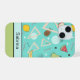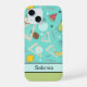 Personalice este estuche para iPhone impreso con un patrón colorido de frutas abstractas y de estilo memphis sobre azul y verde. Simplemente edite el texto del nombre. Elija entre dos estilos para Apple iPhone 15 o una variedad de otros modelos de teléfono en el menú desplegable.