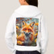 Ein hübscher kleiner Fuchs schaut dich an. Er sitzt zwischen Blumen und spielte mit Schmetterlingen.