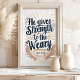Encuentren ánimo y renovación en las palabras atemporales de Isaías 40:29. Esta imprenta de arte edificante presenta el verso "Le da fuerza al cansancio" en negrita, acentuado con delicados florecimientos florales e imágenes reconfortantes de manos abiertas. Perfecto para añadir un toque de fe e inspiración a tu hogar, oficina o espacio de oración.