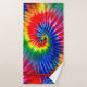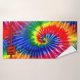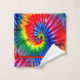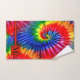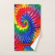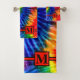 Este divertido juego de toallas de baño presenta un diseño de tinte de corbata en tonos arcoiris de rojo, verde, amarillo, azul y naranja. Cada toalla tiene una barra roja en el fondo con un cuadrado para la letra monograma. Perfecto para un tema retro o hippy.