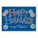 Una divertida tarjeta Happy Holidays, basada en texto, para un vecino, con Ornaments and Lettering, llena de chevrons rojos, azules y verdes y puntos de polka, se dibuja en blanco sobre un fondo azul brillante. También hay una tarjeta delantera personalizado con este diseño en funda que no puede encontrar una tarjeta para el destinatario específico que está buscando.
