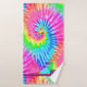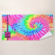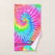 Este divertido juego de toallas de baño presenta un diseño de tintes de corbata en tonalidades giratorias de rosa, verde, amarillo, azul y naranja. Cada toalla tiene una barra rosa en la parte inferior con un cuadrado para la letra monograma. Perfecto para un tema retro o hippy.