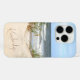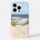 Estuche de teléfono tropical de temática playera con una foto de la orilla del mar con dunas de arena y hierbas marinas, con olas en el fondo y nombre del personalizable o texto de su elección.