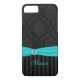 Este moderno damasco negro y gris con rayas funda iPhone 7 tiene una cinta IMPRESA azul turquesa y una hebilla de joyas de diamante IMPRESIONADA. Se puede personalizar con su logotipo, nombre, iniciales u otro texto. Si necesita ayuda, envíe un correo electrónico a niteowlstudio@gmail.com.