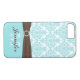 Este moderno y personalizado funda de damasco azul y blanco acuático iPhone 7 con una cinta imprimida marrón chocolate y un broche de joyas tiene un punto para que añadas tu nombre y monograma.