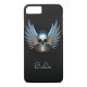 Calavera alada cromada azul sobre fondo de peine de miel con tipo personalizable.