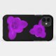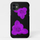 Este increíble estuche para iPhone 4 incluye una foto de una flor de crocus que ha sido alterada digitalmente añadiendo un filtro para convertir la flor en morado. Hay dos de estas flores, una al revés y la otra a la derecha. Las flores están en un fondo negro.