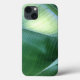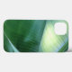 La obra de arte abstracta original de este Funda de iPhone 13, en tonos verdes naturales, es una fotografía original de ZoeSPEAK de hojas sobre un árbol de plátanos. El sol de la mañana ilumina el verde claro de la parte inferior de una hoja de plátano y resalta las costillas de la cara verde más oscura de otra, mientras se curva en las sombras.