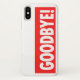 ¡ADIÓS! ¡es inspirado por una celebridad que lleva a cabo una caja similar del teléfono cuando ella se blindaba de los paparazzis! Éste es un caso divertido que ofrece un fondo blanco con una etiqueta roja y una fuente blanca de sans serif. ¡Envíe un gran mensaje a la gente que usted no quiere hablar con más o sus enemigos! ¡ADIÓS!