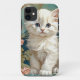 Estuche para iPhone con un gato blanco al estilo de Alphonse Mucha! Este gatito de ojos azules y esponjoso posa con flores rosadas y mantas azules. ¡Un regalo fabuloso para los amantes del gato y de los coleccionistas Art Nouveau!