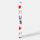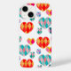 Este estuche de teléfono tiene un diseño Art Déco de corazones hechos de diamantes en tonos rosados, azules, verdes, dorados y rojos.