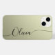 Beige Shimmer Black Elegant Calligraphy Script Personalizado Nombre personalizado iPhone 14 Smart Phone Cases presenta un diseño moderno, sencillo y elegante con su nombre personalizado en una tipografía de caligrafía escrita a mano y elegante sobre un fondo de brillantes color beige metálico. Diseñado por ©Evco Studio www.zazzle.com/store/evcostudio