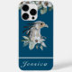 Este estuche de teléfono bonito presenta un hermoso pájaro del paraíso en un estilo acuático. Un ramo de flores blancas se encuentra en la parte superior del funda con un fondo azul intenso. Personalice su nombre en la parte inferior del funda.