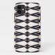 Este estuche de teléfono tiene un diseño art deco de triángulos y diamantes que parecen bolas en azul y oro.