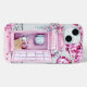 Esta bonita maleta telefónica incluye una cabina de teléfono rosa adornada con flores y un árbol cercano que deja caer flores rosas en el suelo. Puedes personalizar con tu nombre.