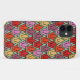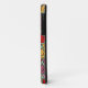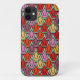 Este estuche de teléfono tiene un diseño art deco de tulipanes de pentagones y trapezoides en naranja, rojo, púrpura, dorado y verde.