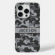 Personaliza esta funda para iPhone 15 pro con camuflaje gris con tu nombre en una fuente moderna y trendy CAP en gris oscuro sobre gris claro. Es masculino y perfecto para tu militar, cazador o amante del aire libre favorito.