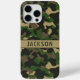 Personaliza esta funda para iPhone 15 Pro con camuflaje verde y marrón multicolor con tu nombre en una fuente CAP moderna y trendy en marrón sobre caqui. ¡Es masculino y perfecto para tu militar, cazador, país o amante del aire libre favorito!