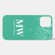 Estuche de teléfono celular moderno en purpurina verde azulado y verde azulado, elegantemente adornado con su monograma de guión, nombre de pila e inicial.