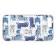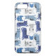 Una maleta telefónica con un patrón de gatos personalizados en varios tonos azules y grises sobre un fondo blanco. Los gatos son estilizados y simplificados, con mínimos detalles. Algunos gatos están tumbados, otros están de pie o sentados. El patrón es denso y cubre toda la superficie del funda.
