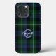 Elegante estuche para iPhone realizado en el tradicional patrón de platillos escoceses Campbell, azul y verde. Un monograma de una sola letra azul personalizado y texto blanco, está listo para personalizar para usted o como una gran idea de regalo.