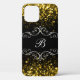 Funda de smartphone monograma para damas con inicial de nombre personalizable en línea y destellos de brillo en tono dorado en el fondo con un diseño elegante para damas o niñas.