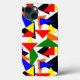 Este estuche de teléfono tiene un diseño Bauhaus de un collage de triángulos en rojo, amarillo, naranja, azul y verde.