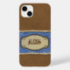 Muestra tu estilo con este jarrón de teléfono personalizado que parece cuero marrón y denim. ¡Buen regalo!
