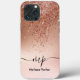 Protect and personalize your phone with this incredibly chic and glamorous custom case! The design features a stunning rose gold ombre effect that fades from deep metallic rose at the top to soft blush pink at the bottom. A waterfall of shimmering faux rose gold glitter confetti cascades from the top, creating a luxurious drip effect. Below this, a delicate monogram (e.g., "mp") and your full name (e.g., "Melissa Parker") are displayed in elegant, modern script. This case is the perfect accessory for anyone who loves fashion, glitter, and personalized style.