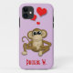 Funda Purple Casemate iPhone 5 con un lindo y afectuoso ilustracion de mono marrón con 3 corazones rojos encima de él, personalizado con tu nombre.