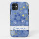 Diseño floral suave sobre fondo de denim descolorido con placa de nombre.