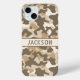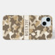 Customize this multi-hued brown desert camouflage iPhone 15 plus case with your name in a trendy modern CAP font in brown on cream. It's masculine and perfect for your favorite military, hunting, country or outdoorsman!