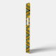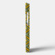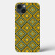 Este estuche de teléfono tiene un diseño art deco de formas diamantíferas con líneas diagonales y diamantes de colores en tonos verdes y amarillos.