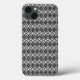 Este estuche de teléfono tiene un diseño art deco de diamantes superpuestos en negro sobre un campo de blanco.