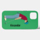 Luminoso golfista verde y rojo poniendo estuche de teléfono de diseño de bola de golf con texto personalizable.