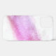 Estuche Girly para iPhone con purpurina falso rosa y morado, fondo de mármol blanco.