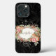 "Elegante Funda de Monograma iPhone 13 con guion negro rosa floral de época". Elegante ramo botánico floral vintage enmarca tu nombre y monograma sobre un fondo de damasco en tono negro. Creado por la artista con licencia internacional Audrey Jeanne Roberts, copyright.