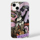 Estuche de teléfono en un colorido estilo graffiti. Agregue el nombre del propietario del teléfono. Los colores principales son malva, rosa y violeta,