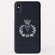 Un cromo plateado como el escocés el diseño de aplicación en un fondo de impresión de fibra de carbono azul marino rancia para un gran regalo de piel de dispositivo personalizado.