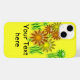 Gráfico 3D de margaritas en verde, amarillo y naranja. Las hojas de pasto se entremezclan entre las flores. Personalice cambiando o eliminando texto. Personalizar cambiando el color de fondo (actualmente amarillo)