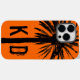 Estuche monogramado para iPhone con diseño de palmeras. Portada de teléfono Guay con ilustracion de temas de verano y monograma personalizable. Agregue sus iniciales de nombre al diseño. Color de fondo de la puesta de sol personalizado. Vivid naranja.