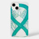 El estuche para iPhone de ángel de guardián presenta el arte de una pintura de ángel de cinta verde de conciencia verde verde azulada. El color verde verde azulado de la cinta significa apoyo a la agorafobia, trastorno de ansiedad, trastorno de identidad disociativa, alergias alimentarias, síndrome X frágil, miastenia grave, trastorno obsesivo-compulsivo, cáncer de ovario, cáncer de cuello uterino, trastorno de pánico o estrés (TEPT), síndrome ovárico poliquístico, enfermedad renal poliquística, Abuso sexual, asalto sexual, abuso de sustancias, enfermedad por maltrato y síndrome de Tourette. El estuche para iPhone de arte de la cinta de ángel de la conciencia verde verde azulada se puede personalizar con mensajes personalizados para hacer estuches telefónicos de gran causa para recaudadores de fondos, regalos de concientización u otros eventos o ocasiones especiales.