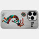 Personaliza este estuche único para teléfonos celulares Kokopelli "One of a Kind". Se trata de un Kokopelli del suroeste en turquesa, Naranja y negro jugando a la flauta y bailando bajo el sol con fondo plateado. Diseño de Arte Gráfico original creado por el artista Kerry Miller.