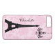 Esta romántica estuche para iPhone rosa está decorada con la Torre Eiffel y una lámpara de araña de cristal en forma de damasco rosa, todo personalizado con tu nombre en un tipo de letra sofisticada, lo que la convierte en un accesorio de bonito.