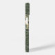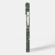 El estuche para iPhone presenta un hermoso diseño de arte digital generado por IA de una mariposa Steampunk en verdes sobre un fondo vintage de viñas ornamentadas.