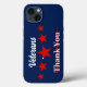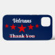 funda del iPhone 13, cuenta con palabras acerca de los veteranos," gracias los veteranos" con fondo azul, y estrellas rojas entre las palabras, Adecuado para celebrar el día de los veteranos.