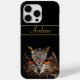 Una imagen muy fresca de una lechuza de aspecto feroz decora esta caja de teléfono. Personalice con el nombre del destinatario o del cliente. Paleta de color negro, dorado y naranja. ¡Bonito!