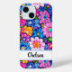 Haz una declaración retro con esta funda de teléfono iphone 15 inspirada en la potencia floral hippie de los 70. Es moderna y trendy con flores pintadas de colores brillantes. Hazlo único con tu nombre en una fuente de escritura moderna en negro. ¡Se verá fabuloso en tu teléfono!