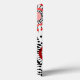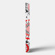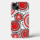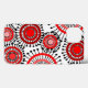 Este estuche de teléfono tiene un diseño de anillos y círculos en tonos rojos con líneas negras cruzando detrás de ellos formando flores en un campo de blanco.