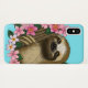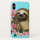 Un lindo perezoso sentado entre flores rosadas sobre un fondo azul